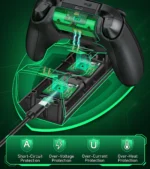 4.When not gaming, simply put the equipped controller on the charging station and it will begin charging automatically without needing to remove the battery. The green LED indicator will blink when the controller is being charged, and stays lit to signal that charging is complete.